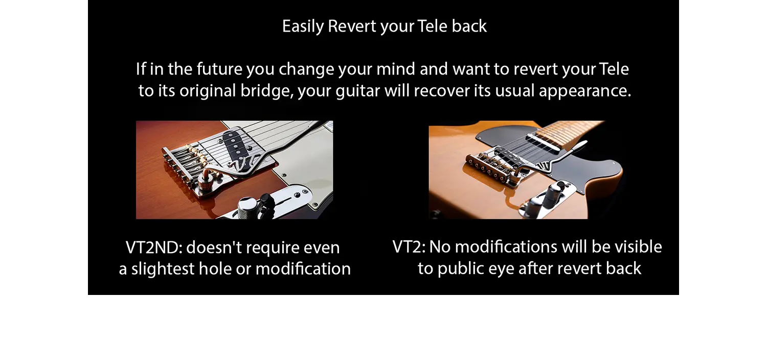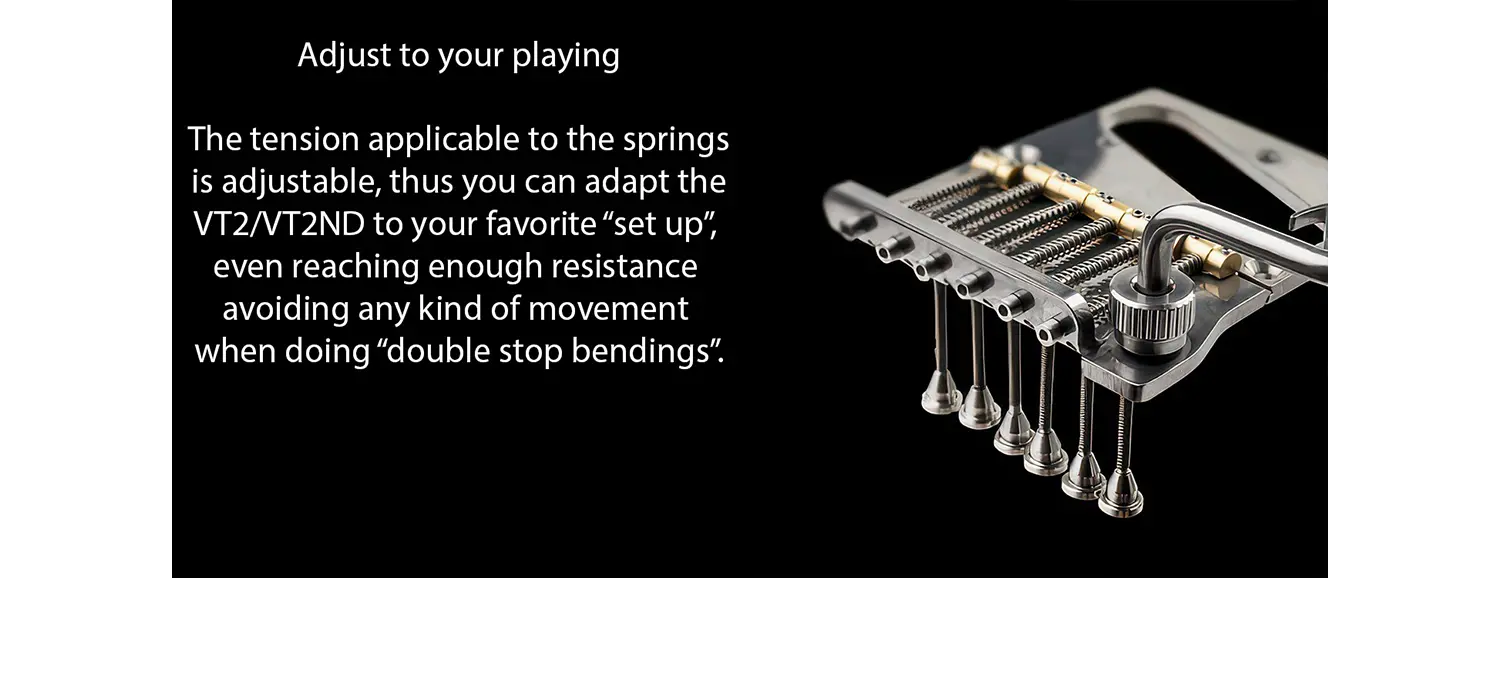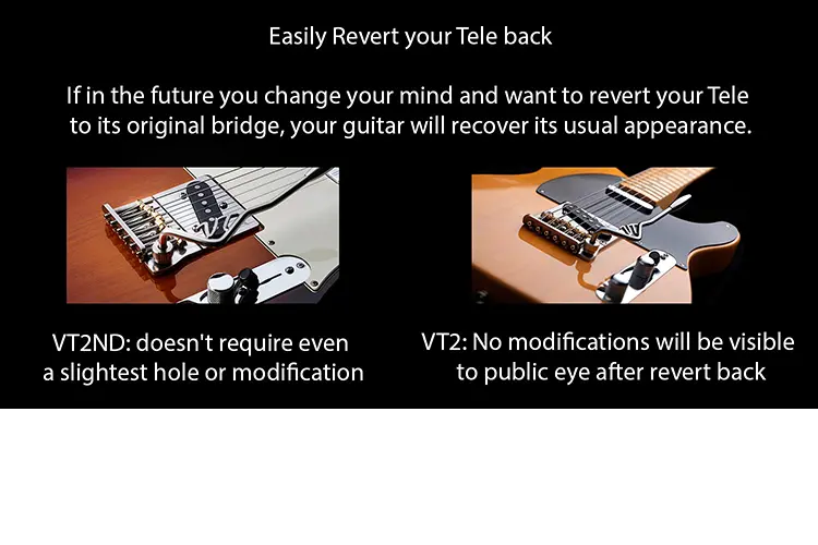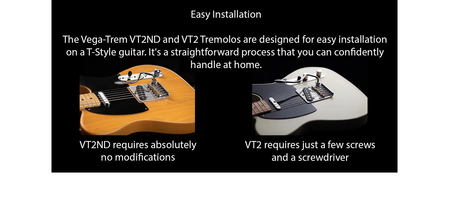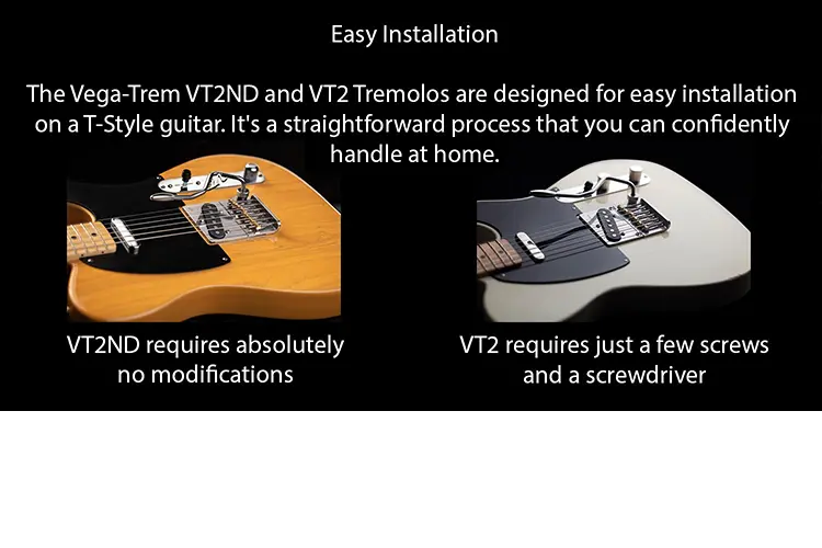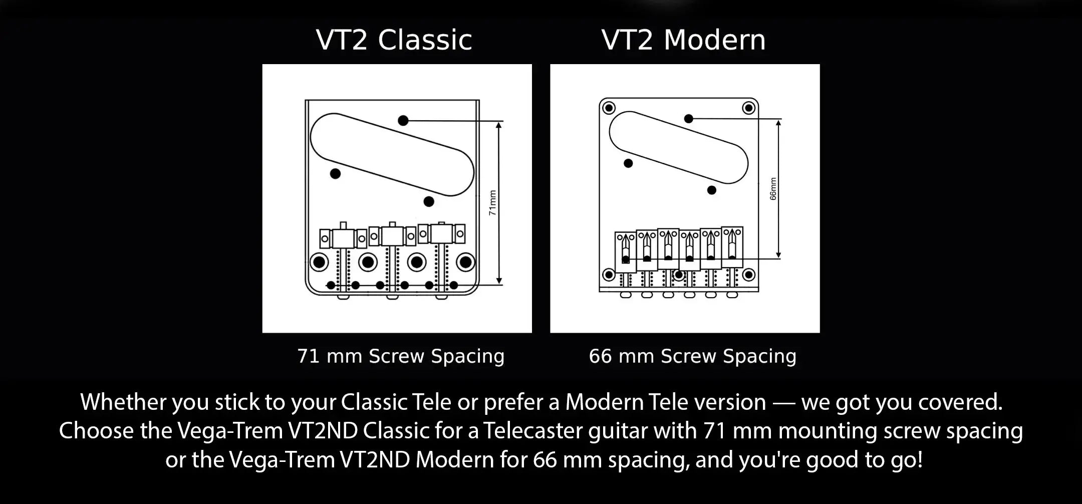 Choose the Vega-Trem VT2ND Classic for a Telecaster guitar with 71 mm mounting screw spacing or the Vega-Trem VT2ND Modern for 66 mm spacing, and you're good to go!