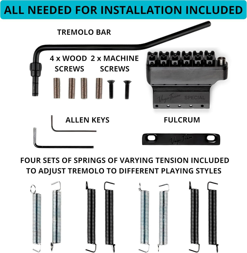 Meet the VT1 Special—the same legendary VT1 architecture you trust, now voiced with a premium brass block at its core. It drops into any Strat-style 2-points tremolo route with no drilling, sanding, or permanent mods, preserving the feel, stability, and wide expressive range players love—while adding the warm, musical character brass is famous for. Installation is straightforward at home, and the included high-to-ultra-low tension springs let you dial in the exact feel for your technique. For best performance, we recommend low-friction nut solutions and locking tuners (as with the original VT1 approach). The VT1 Special keeps your guitar intact, stays rock-solid in tune, and delivers smooth, quiet, precise tremolo travel—now with its own distinct timbre thanks to the brass heart. Finished in high-quality stainless steel with a Black top surface (this listing), Right-handed. Pack includes tremolo block and arm, fulcrum plate with fixing screws, springs, and Allen keys.