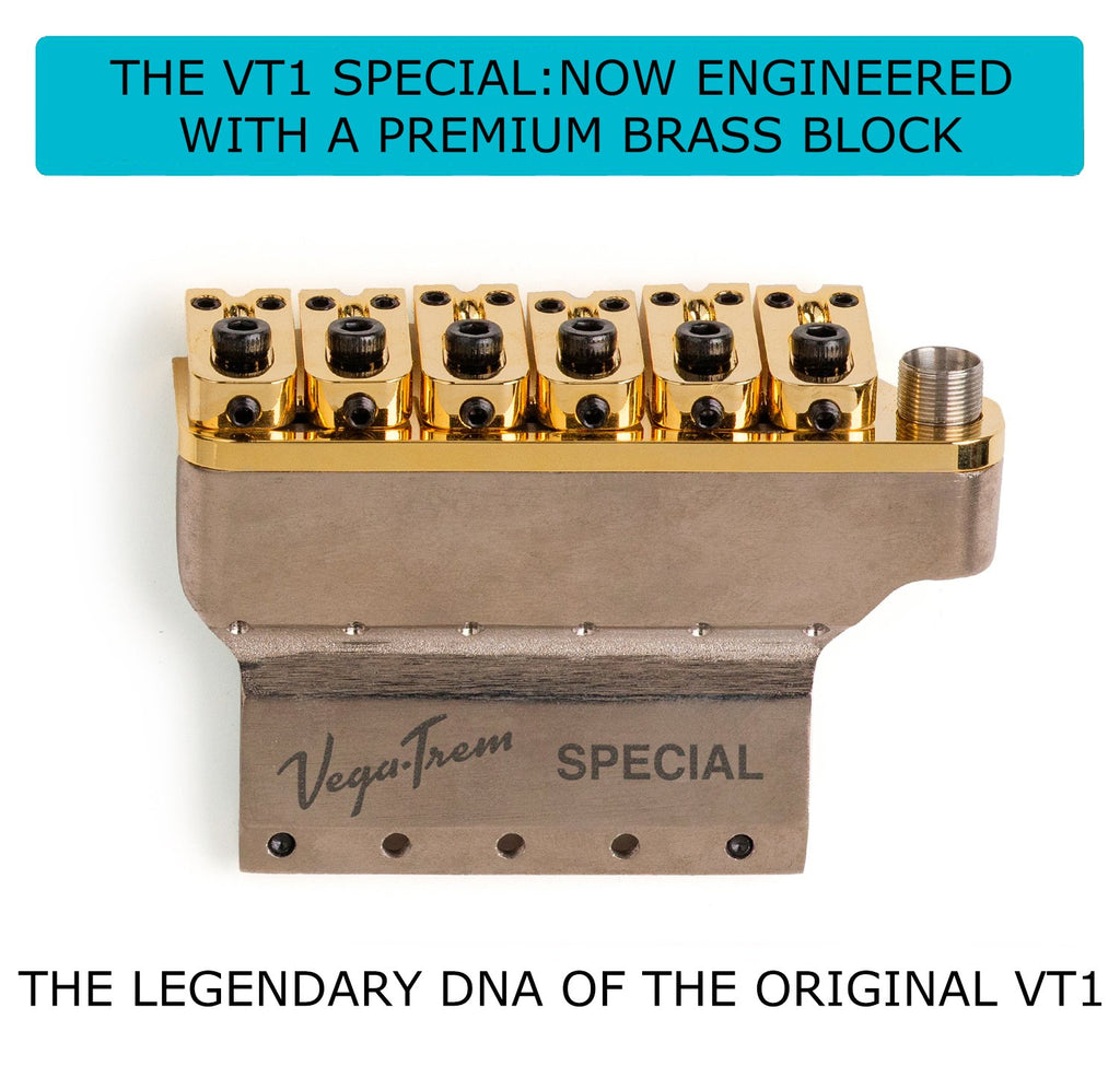 Meet the VT1 Special—the same legendary VT1 architecture you trust, now voiced with a premium brass block at its core. It drops into any Strat-style 6-screw tremolo route with no drilling, sanding, or permanent mods, preserving the feel, stability, and wide expressive range players love—while adding the warm, musical character brass is famous for. Installation is straightforward at home, and the included high-to-ultra-low tension springs let you dial in the exact feel for your technique. For best performance, we recommend low-friction nut solutions and locking tuners (as with the original VT1 approach). The VT1 Special keeps your guitar intact, stays rock-solid in tune, and delivers smooth, quiet, precise tremolo travel—now with its own distinct timbre thanks to the brass heart. Finished in high-quality stainless steel with a Gold top surface (this listing), Right-handed. Pack includes tremolo block and arm, fulcrum plate with fixing screws, springs, and Allen keys.Fits any stratocaster-style guitar with preinstalled tremolo (6 screws)No guitar modifications requiredFits perfectly into the tremolo original cavity, no extra drillholes requiredEasily installed at home, everything needed for installation is includedEasy set up and re-string, low maintenance, no microtunersSuperior tuning stabilitySmooth and precise tremolo action, no unwanted noises