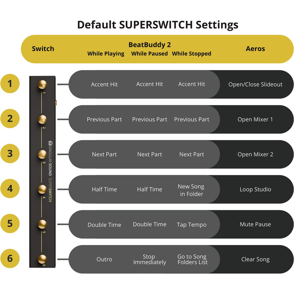 Meet the Singular Sound SuperSwitch—a rugged, low-profile 6-button controller designed specifically for BeatBuddy 2 and Aeros. Each button can be assigned independently, and SuperSwitch even changes behavior depending on whether your BeatBuddy 2 is playing, paused, or stopped, giving you instant access to fills, transitions, part changes, half/double-time, outros, and more. For Aeros users, SuperSwitch provides one-tap access to Mixer 1/2, Slideout, Loop Studio, New Song and other performance shortcuts. Built with whisper-quiet switches in a sleek metal enclosure, it’s made for the road and quiet enough for the studio.
