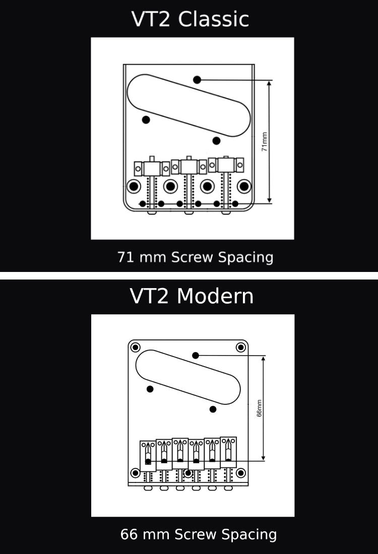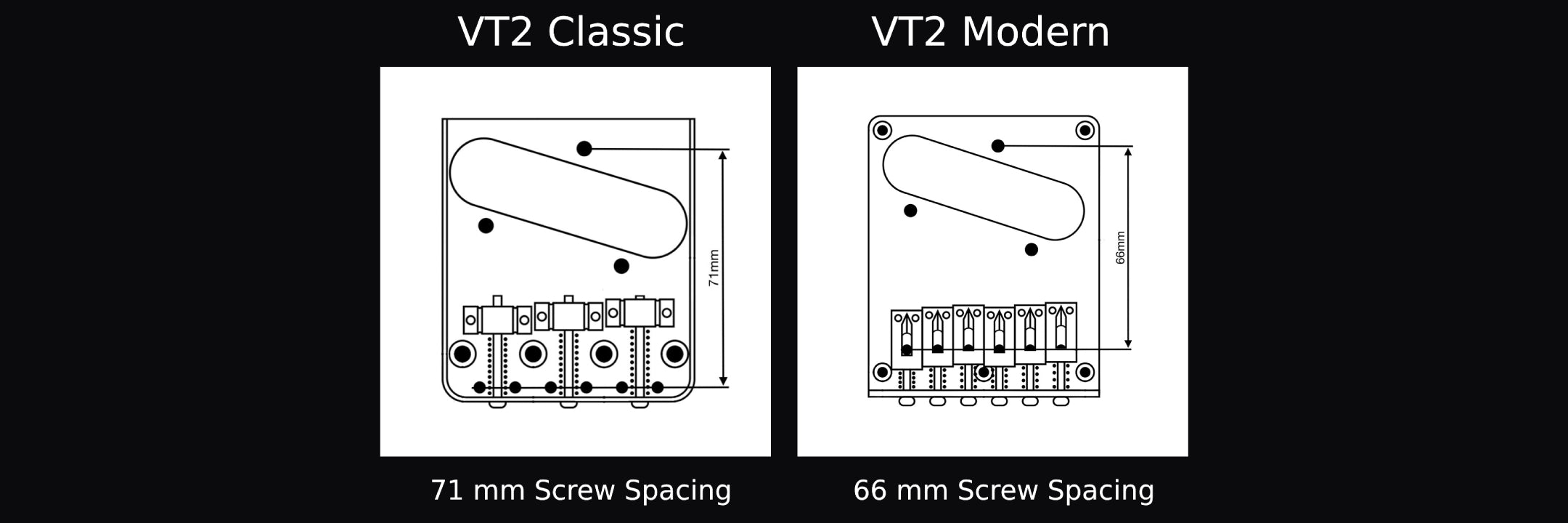 Whether you stick to your Classic Tele or prefer a Modern Tele version — we got you covered. Choose the Vega-Trem VT2 Classic for a Telecaster guitar with 71 mm mounting screw spacing or the Vega-Trem VT2 Modern for 66 mm spacing, and you're good to go!